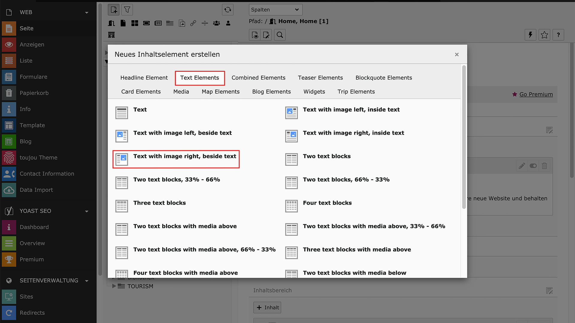 - Im Reiter Text Elements wählen Sie Text with media right, beside text.