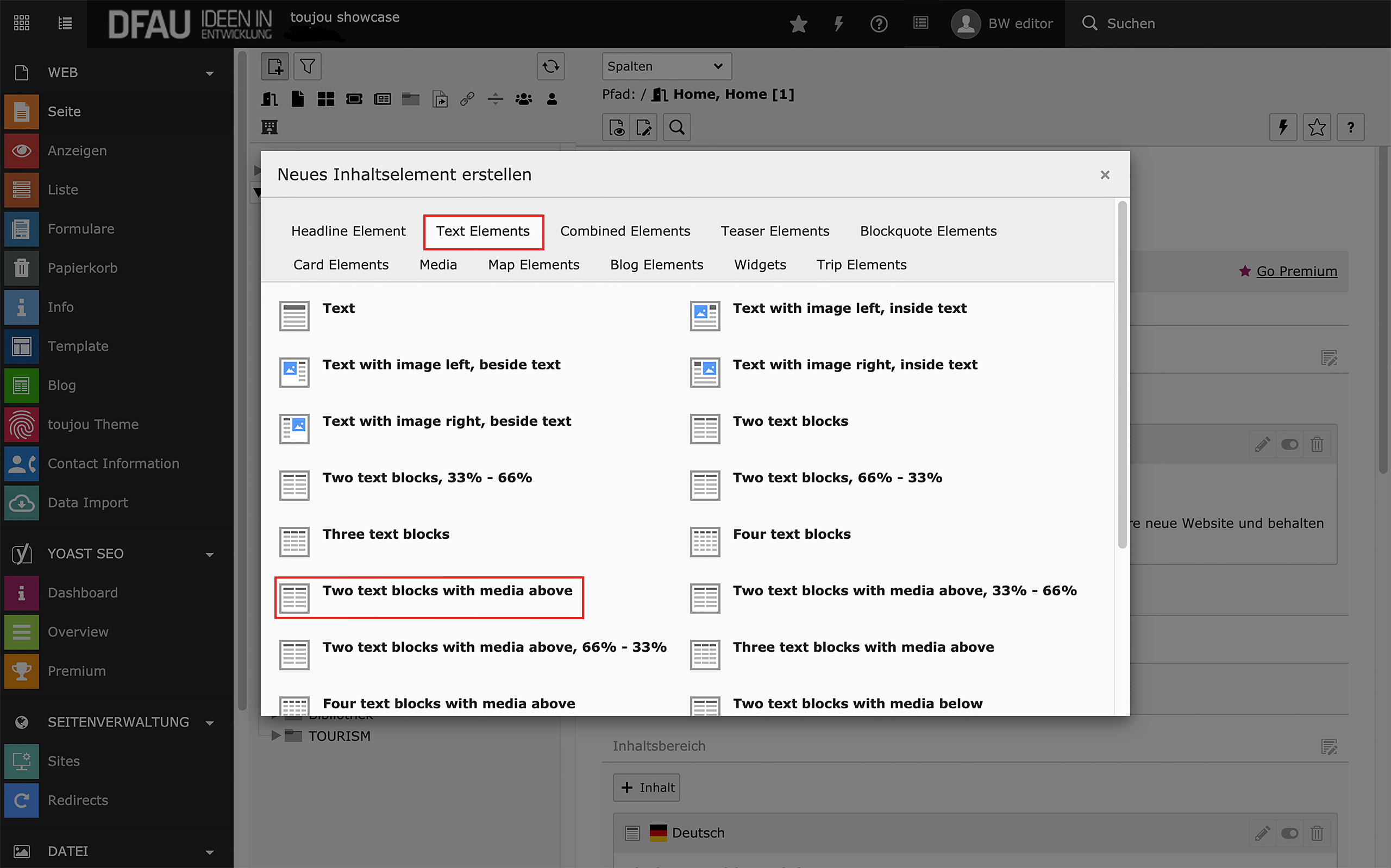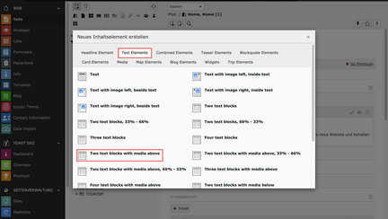 - Im Reiter Text Elements wählen Sie Two text blocks with media above.