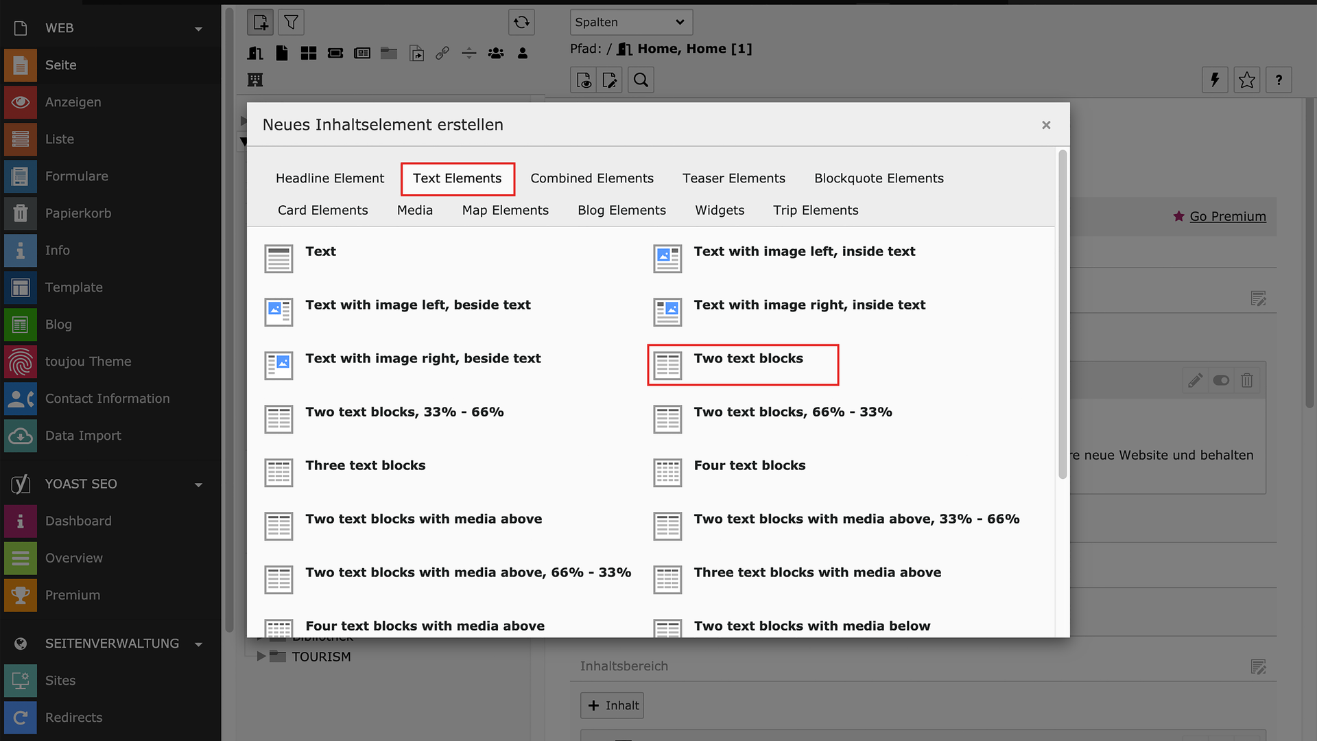 - Im Reiter Text Elements wählen Sie Two text blocks.
