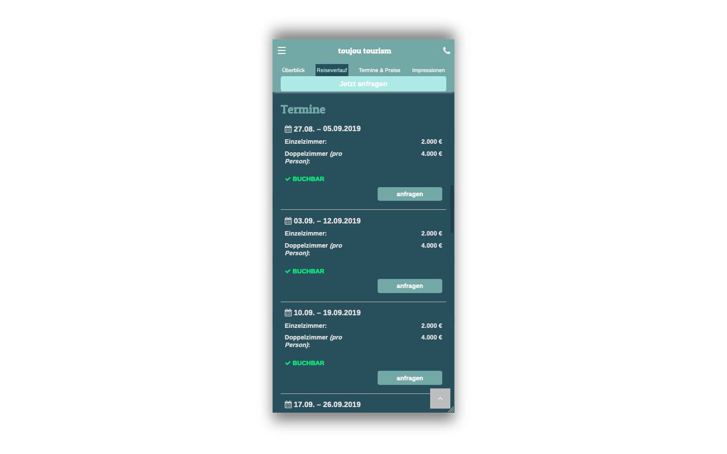 In toujou finden Sie vorkonfigurierte Reisedarstellungselemente mit den notwendigen Freiheiten dort, wo Sie diese brauchen. Das Erscheinungsbild wird zentral gesteuert und inklusive responsivem Verhalten angeboten. Buttons, Links, Ausrichtung und Textstile werden durch den Redakteur gesteuert.