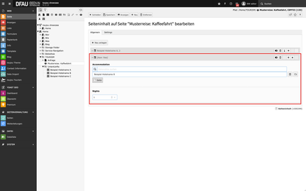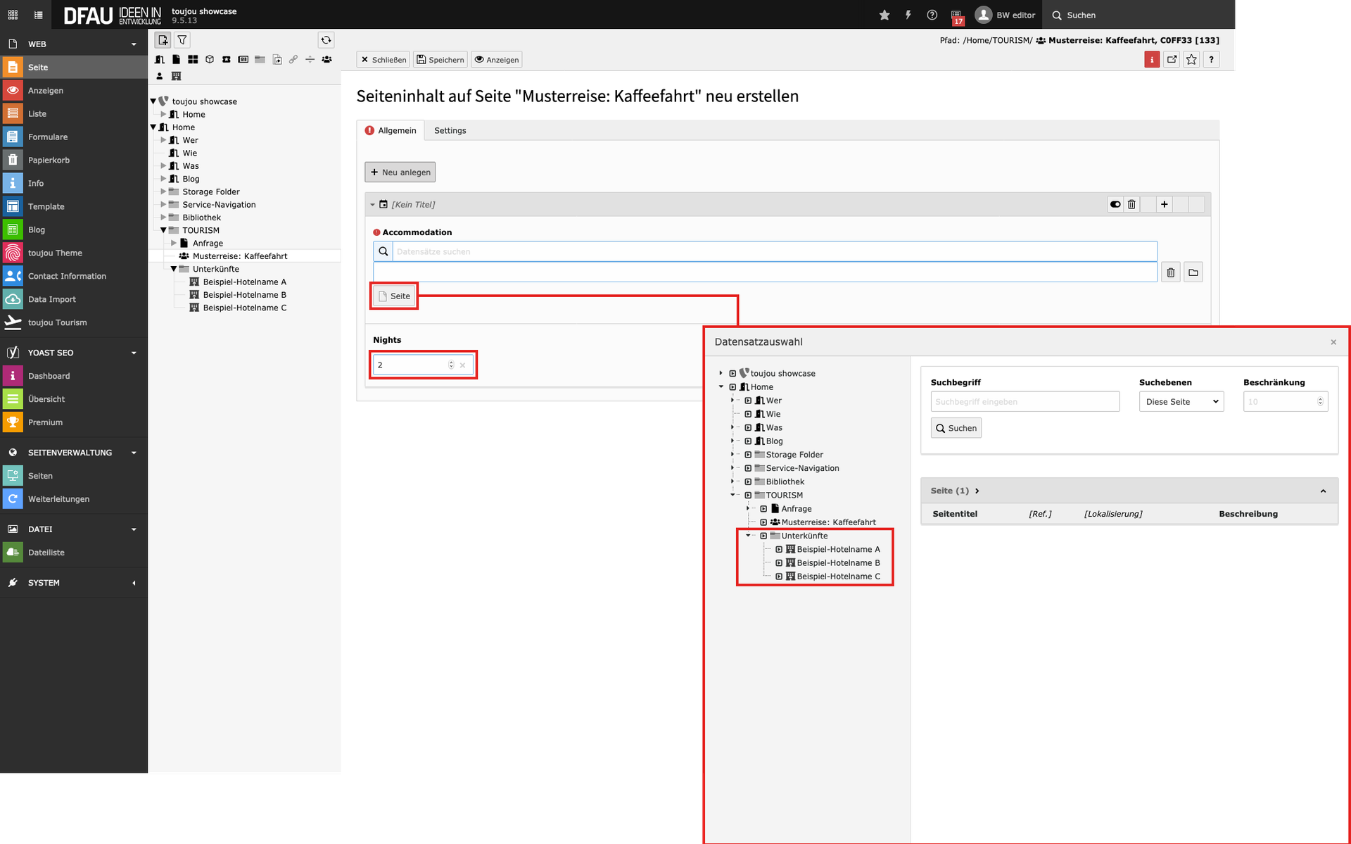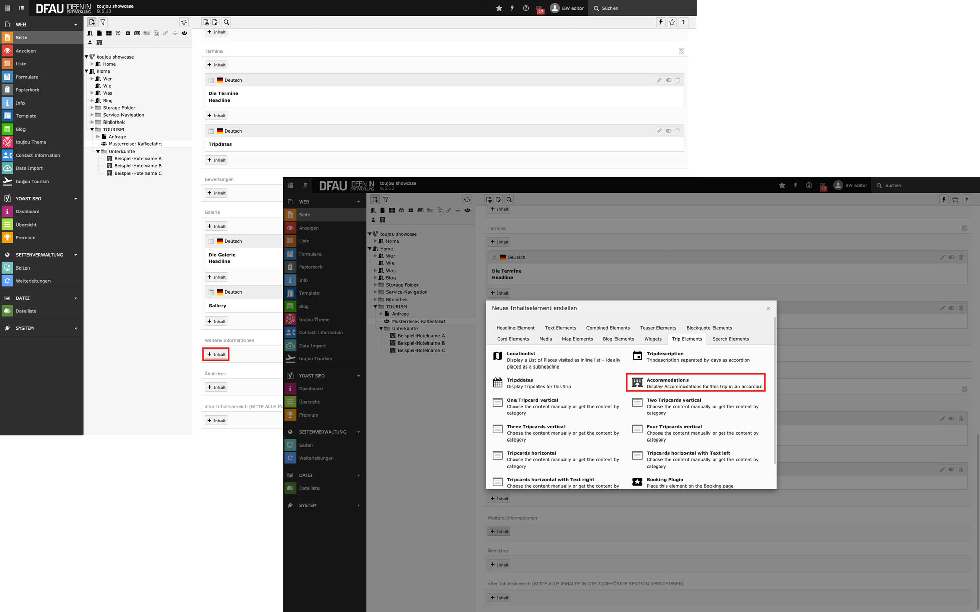 - Alle Inhalte zur Unterkunft (bis auf die Angabe der Nächte je Reise) werden in den Seiteneigenschaften einer Accomodation Page vor Erstellung des Elements angelegt.