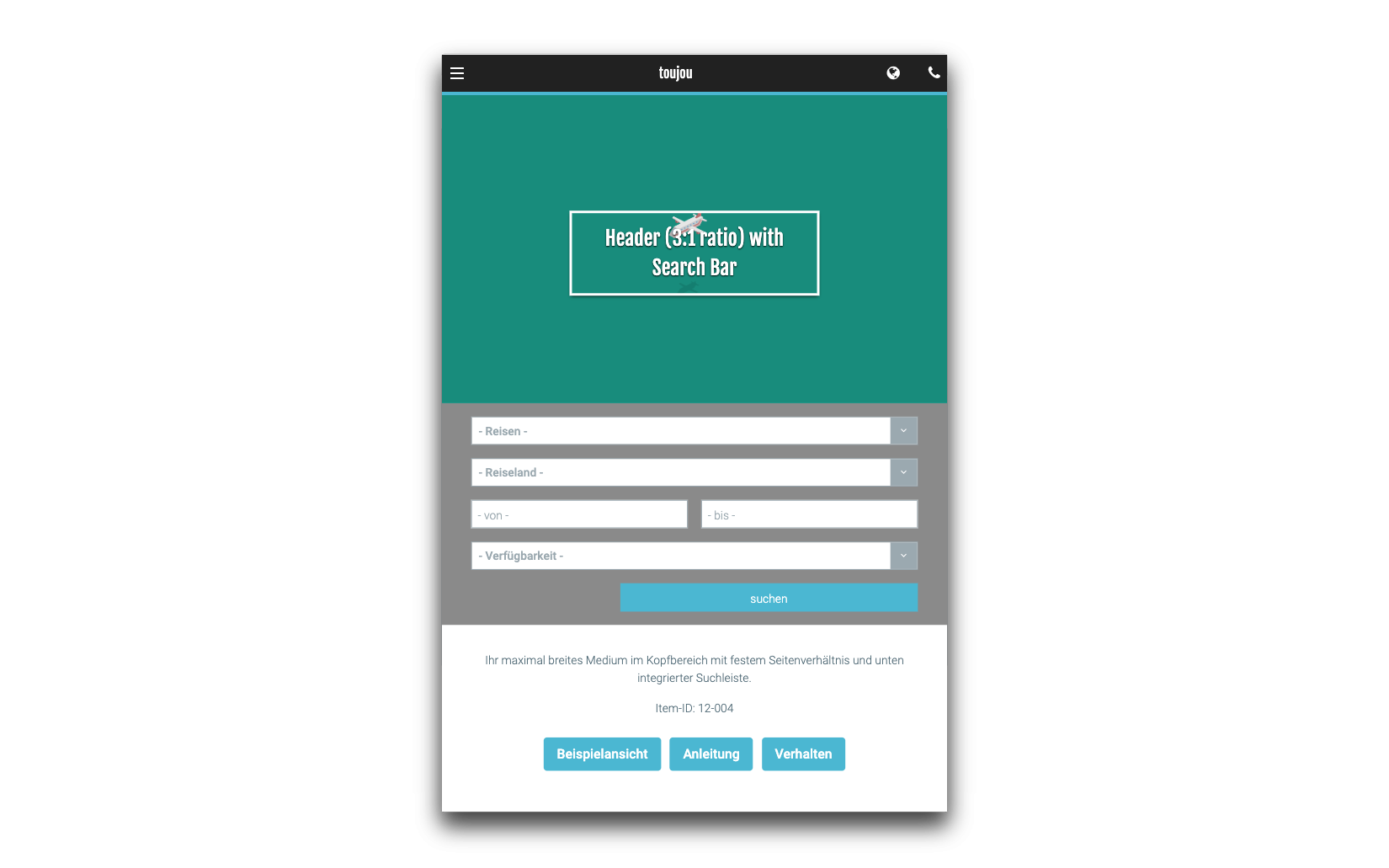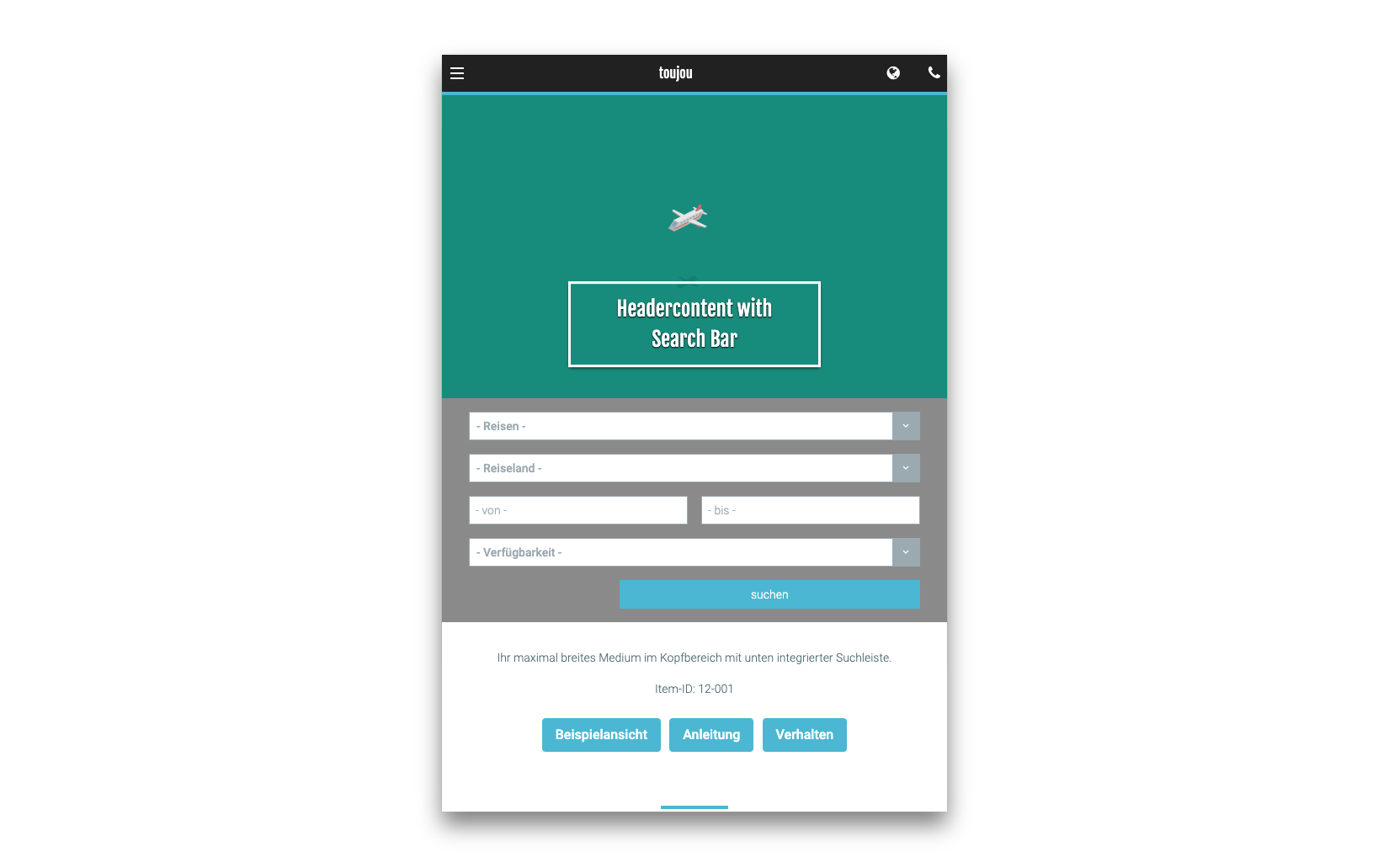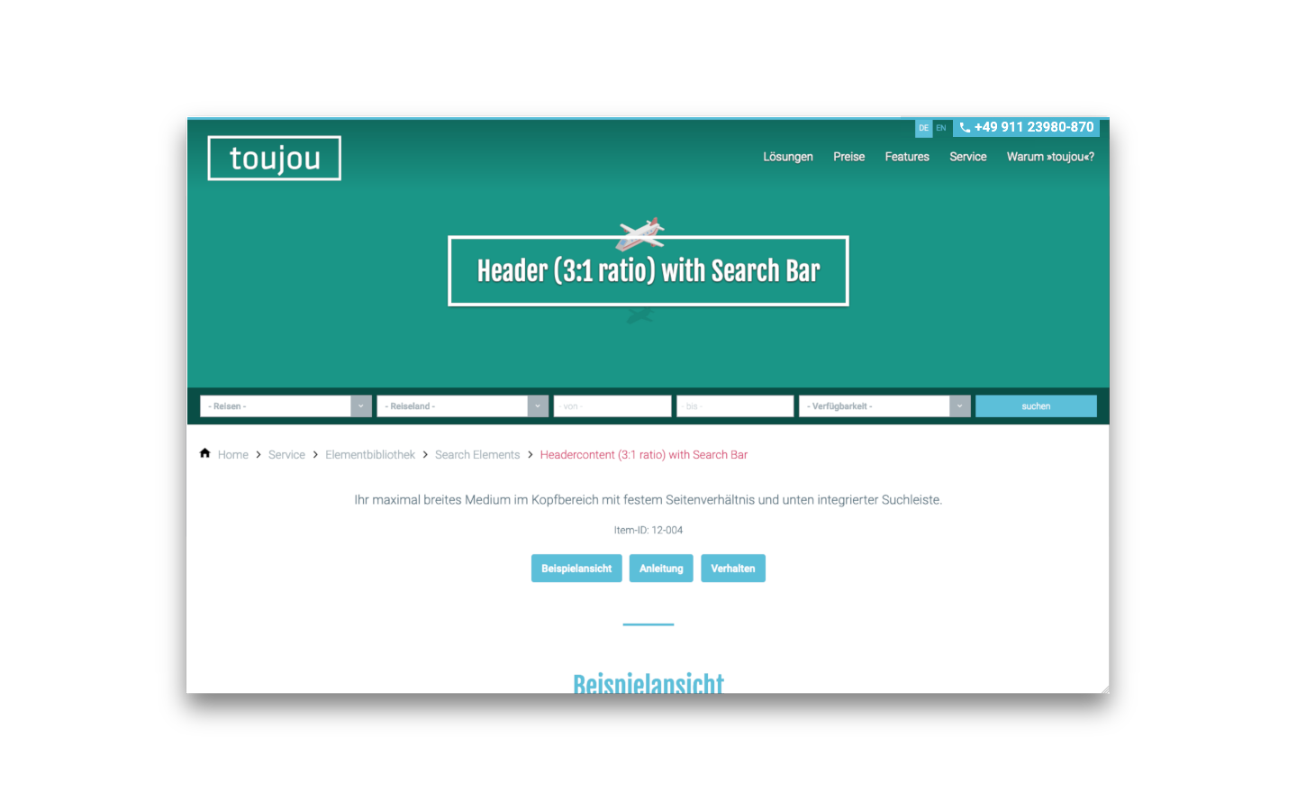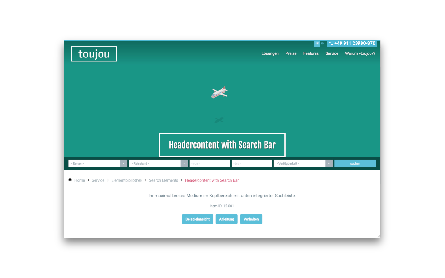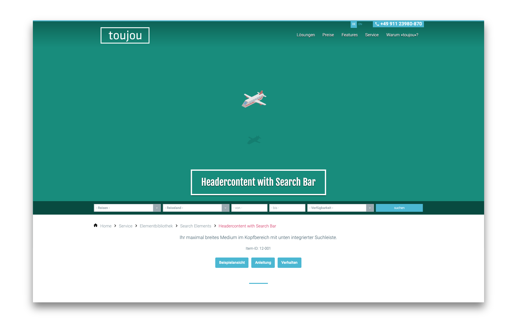 Auf dieser Seite finden Sie alle in toujou verfügbaren Reisesuchelemente. Um nicht mit echten Inhalten verwechselt zu werden, verwenden wir in der Bibliothek Musterreisen und -texte.