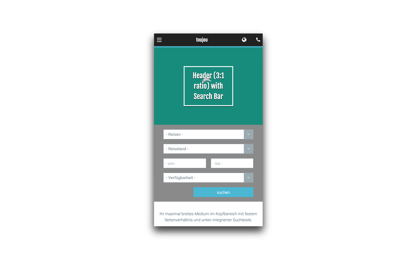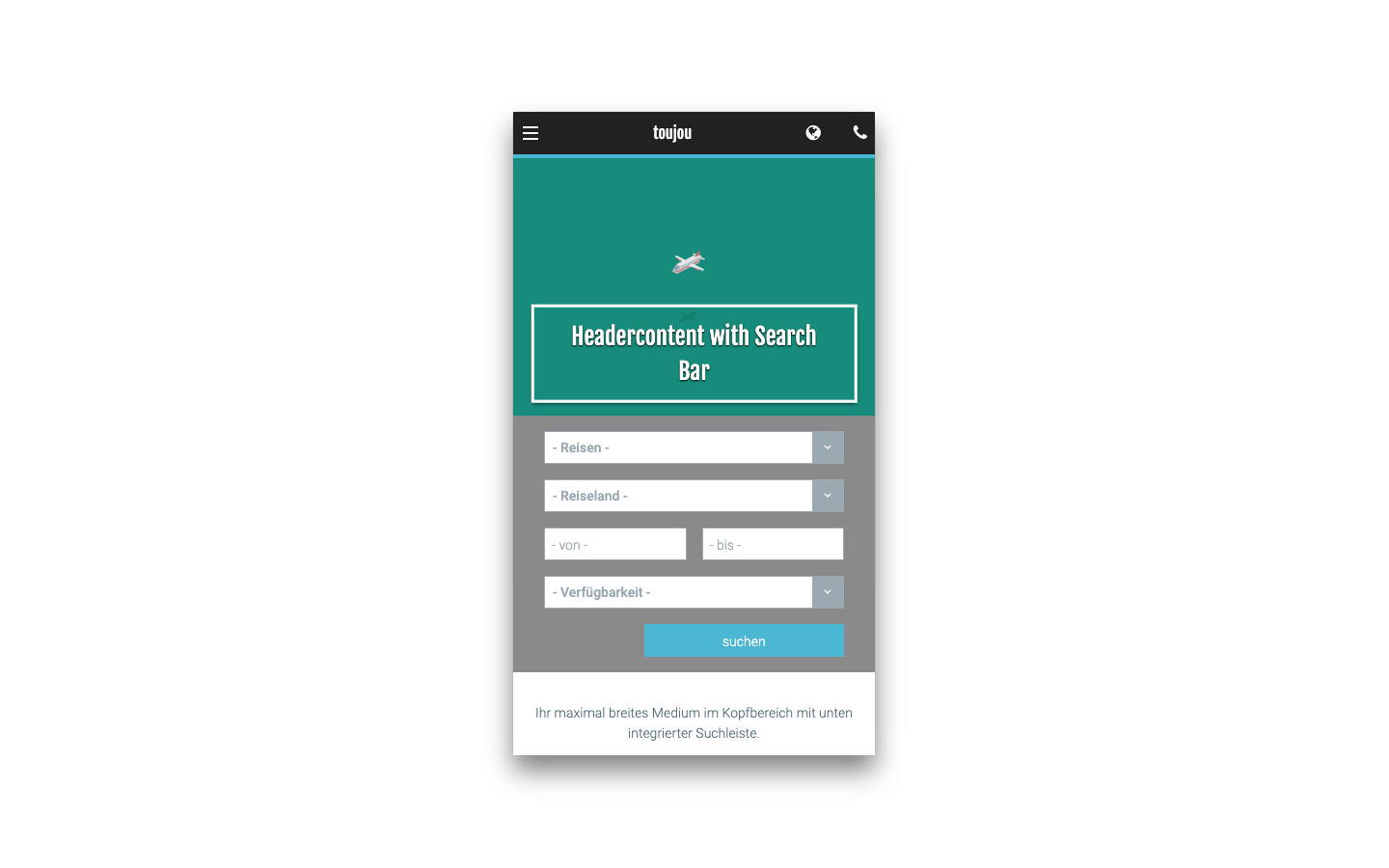 In toujou finden Sie vorkonfigurierte Reisesuchelemente, die Sie wie Headercontent-Elemente bzw. ähnlich der kombinierten Elemente flexibel einsetzen können. Das Erscheinungsbild wird zentral gesteuert und inklusive responsivem Verhalten angeboten. Voraussetzung für die Nutzung der Elemente ist die Erstellung einer Suchseite. Optional können Sie an der Darstellung der Suche weitere Konfigurationen vornehmen.