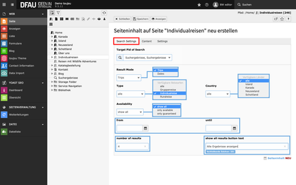 - Reiter Search Settings: Im Dropdownmenü Target Pid of Search werden ausschließlich Seiten des Typs Search Page angezeigt.