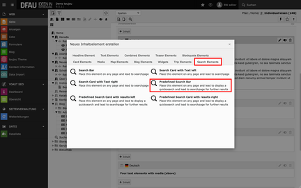 - Klicken Sie auf den Button Inhalt und wählen Sie unter dem Reiter Search Elements das Element Predefined Search Bar aus.