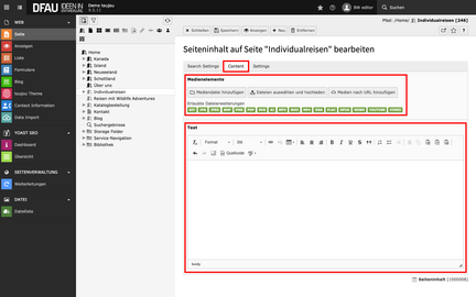 - Reiter Content: Sie haben die Möglichkeit, rechts von den Suchergebnissen eingeschränkt Content in Form eines Texts und/oder Bilds einzufügen.