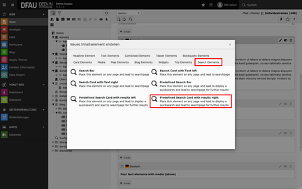 - Klicken Sie auf den Button Inhalt und wählen Sie unter dem Reiter Search Elements das Element Predefined Search Card with results right aus.