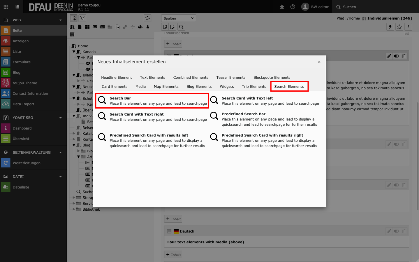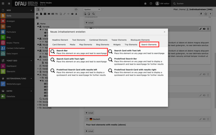 - Klicken Sie auf den Button Inhalt und wählen Sie unter dem Reiter Search Elements das Element Search Bar aus.