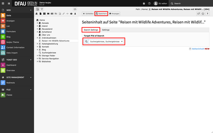 - Reiter Search Settings: Im Dropdownmenü Target Pid of Search werden ausschließlich Seiten des Typs Search Page angezeigt.