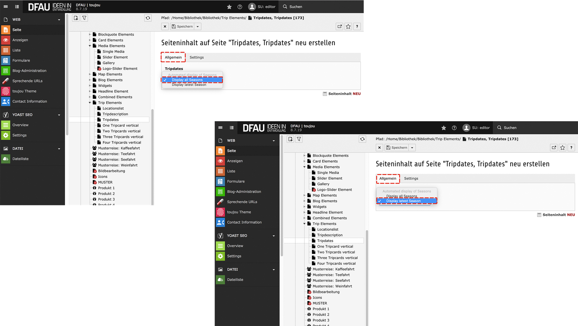 Voraussetzung für das Anlegen von Tripdates als Element ist die Bearbeitung der Reiseseiteneigenschaften einer jeweiligen Reise. Aus diesen Informationen speisen sich die Angaben in den Tripdates.