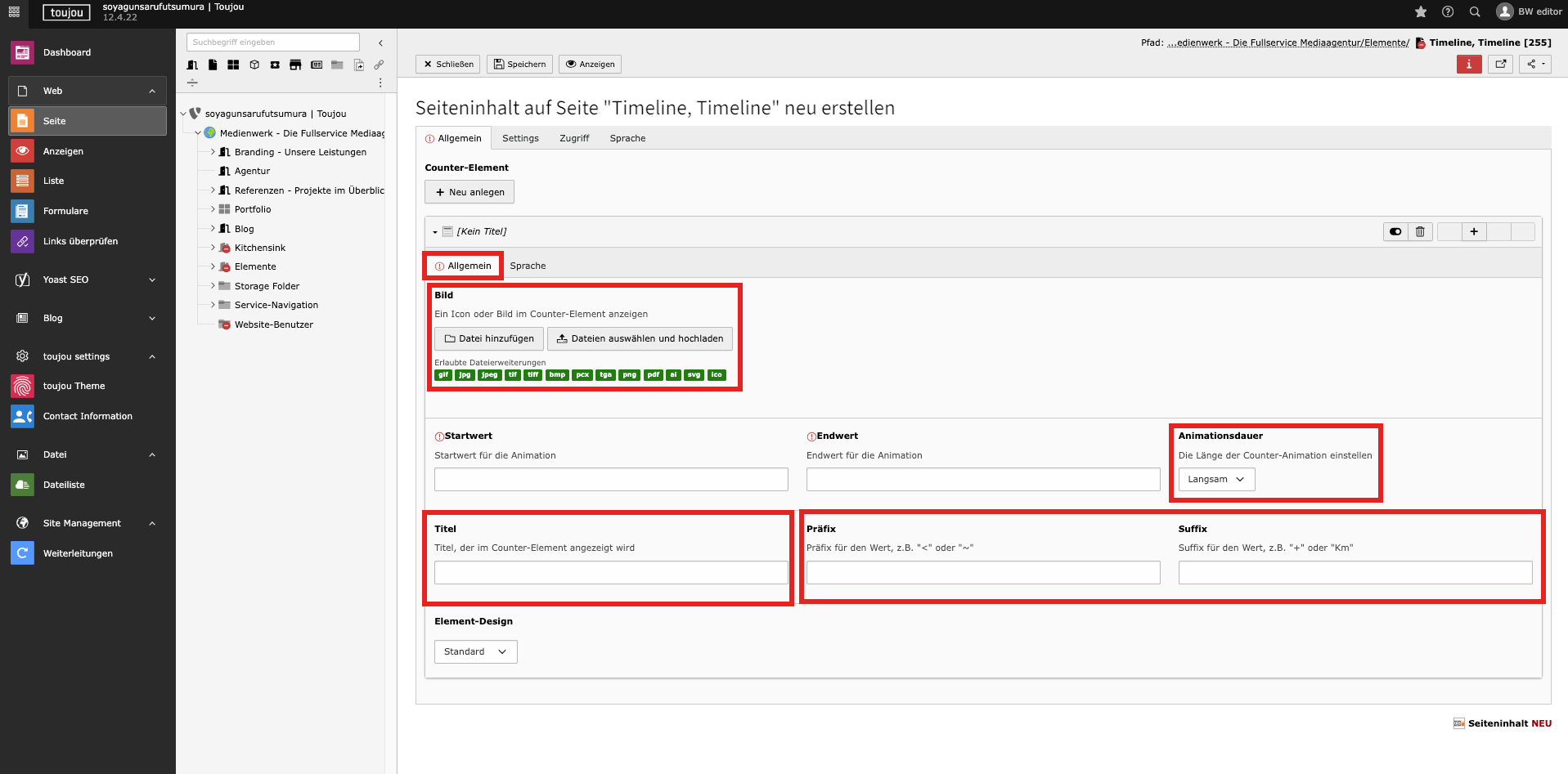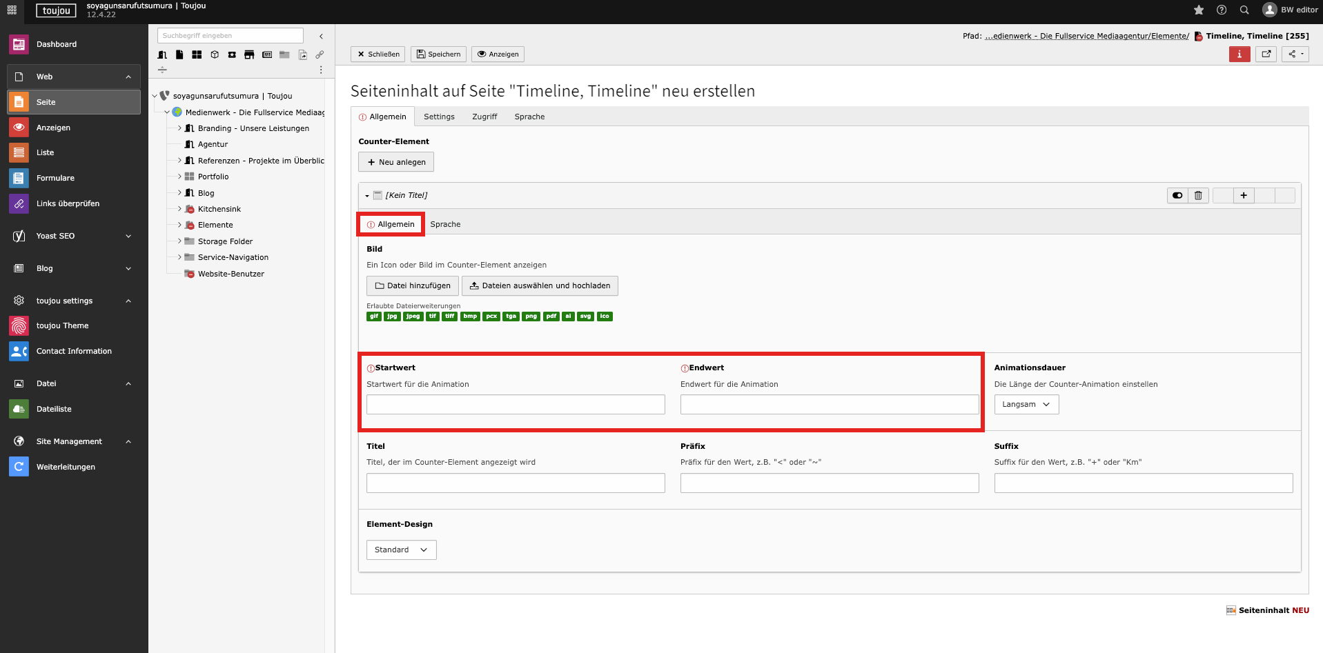 - Beide Felder sind in allen Countern für die Funktionalität des gesamten Elements auszufüllen.
