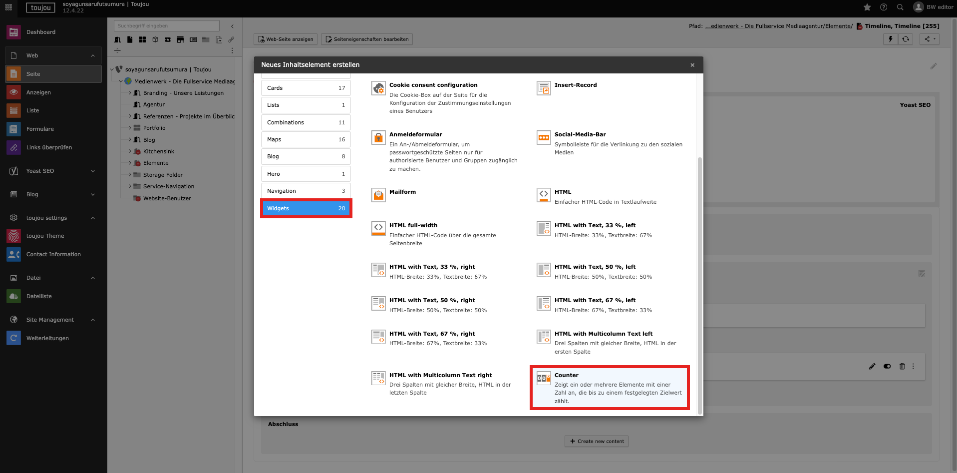 - Nachdem Sie im Inhaltsbereich Ihrer Seite auf + Inhalt geklickt haben, öffnet sich das Fenster zur Auswahl des Elements. Wählen Sie den Reiter Widgets und anschließend Counter.