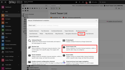 - Im Reiter Widgets wählen Sie das Element Event Teaser List.