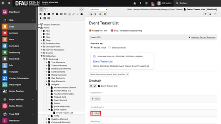 - Klicken Sie auf den Button Inhalt, um das Element Event Teaser List anzulegen.