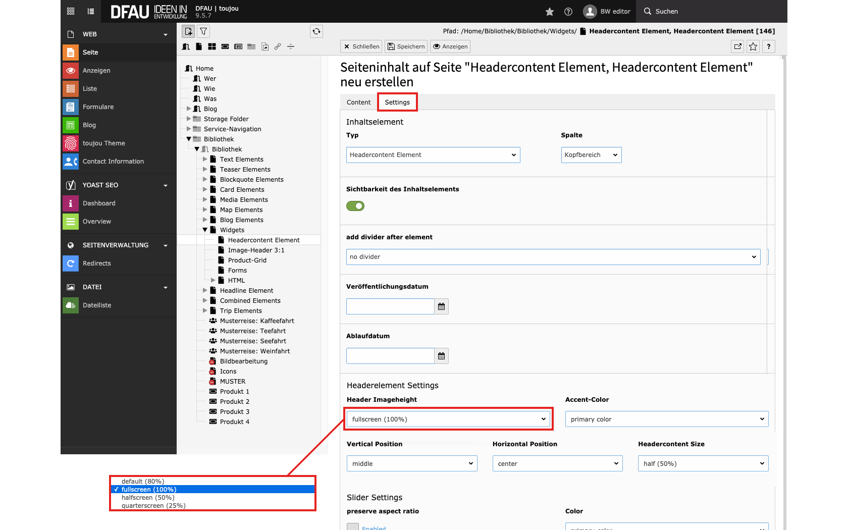 - Klicken Sie auf den Button Inhalt und wählen unter dem Reiter Widgets das Element Headercontent Element aus.