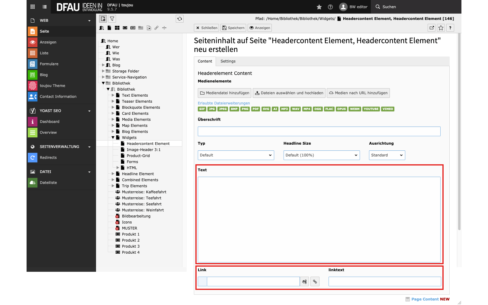 - Sie haben die Möglichkeit, in den Bereichen Überschrift sowieText und Link (siehe nächsten Schritt) Inhalte im Header zu platzieren. Überschriften können auch ohne weiteren Text & Link vergeben werden.
