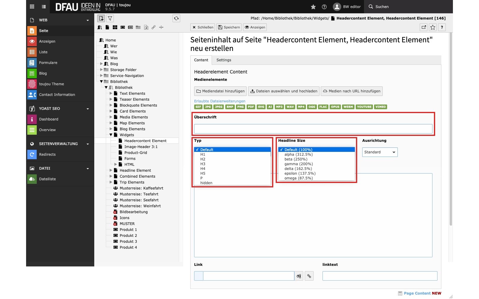 - Im Reiter Content ist per Default eine H2-Tag vergeben. Ändern Sie diese Einstellung bei Bedarf über Typ und Headline Size (mehr zu Headlines ❯).