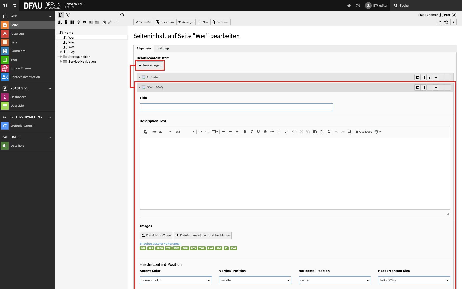 - Klicken Sie im Reiter Allgemein auf + Neu anlegen, um den ersten Headercontent-Slider zu erstellen.