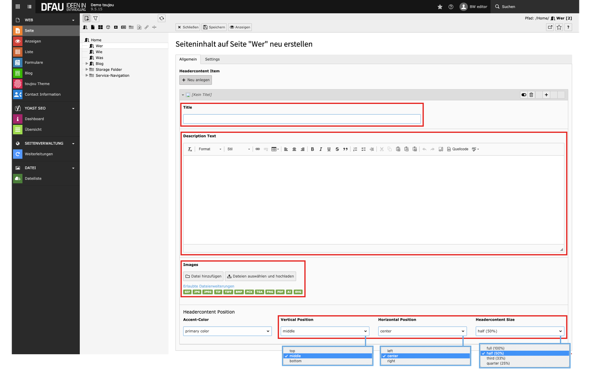 - Headercontent Position: Bestimmen Sie über die Vertical und Horizontal Position und Size die Platzierung und Größe Ihres Headercontents.