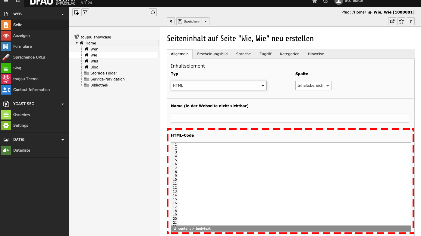 - Klicken Sie auf den Button Inhalt, um ein HTML-Element zu erstellen.