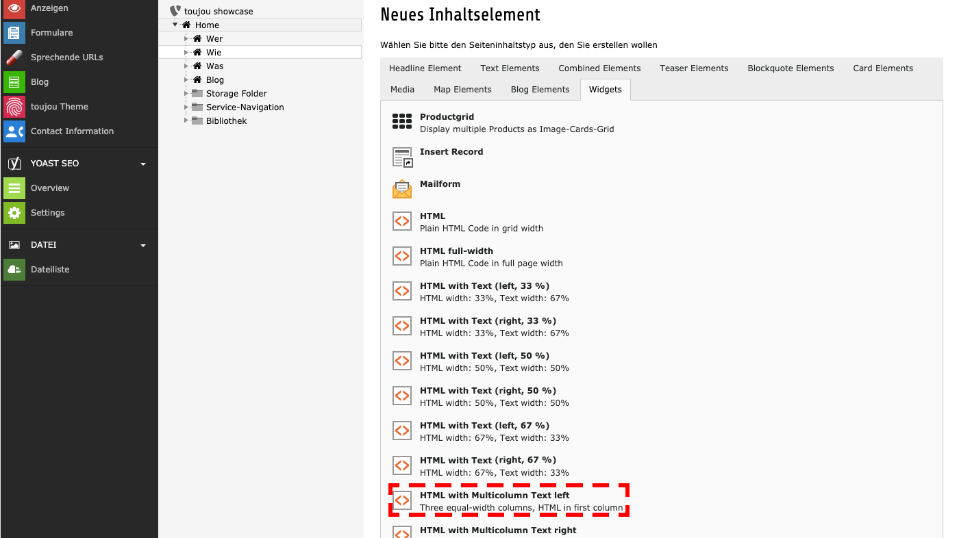- Im Reiter Widgets wählen Sie HTML Multicolumn with text left; Three equal width columns, HTML in first column.