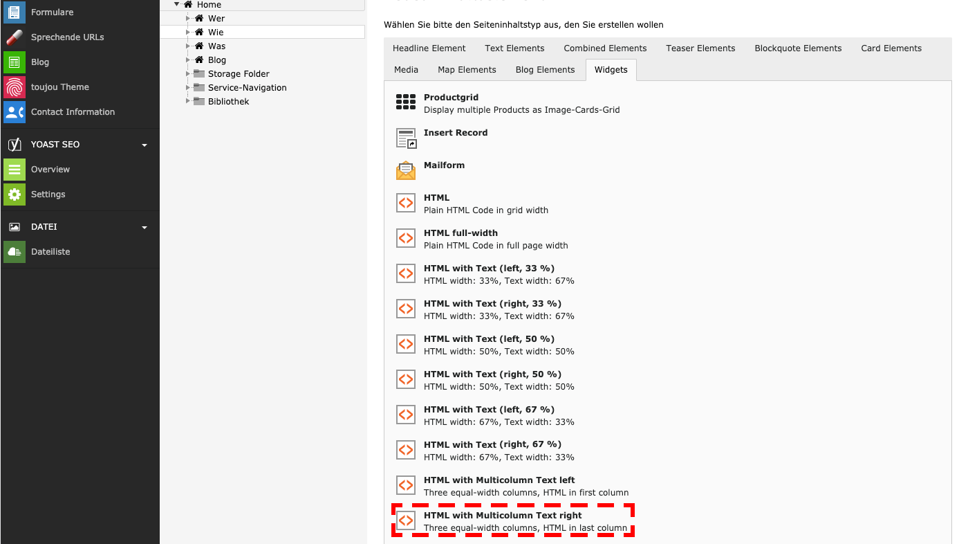 - Im Reiter Widgets wählen Sie HTML Multicolumn with text right; Three equal width columns, HTML in last column.