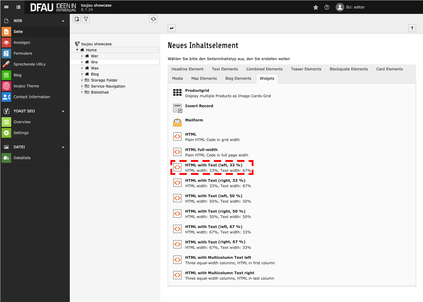 - Im Reiter Widgets wählen Sie HTML with text (left, 33 %); HTML width: 33%, Text width: 67%.