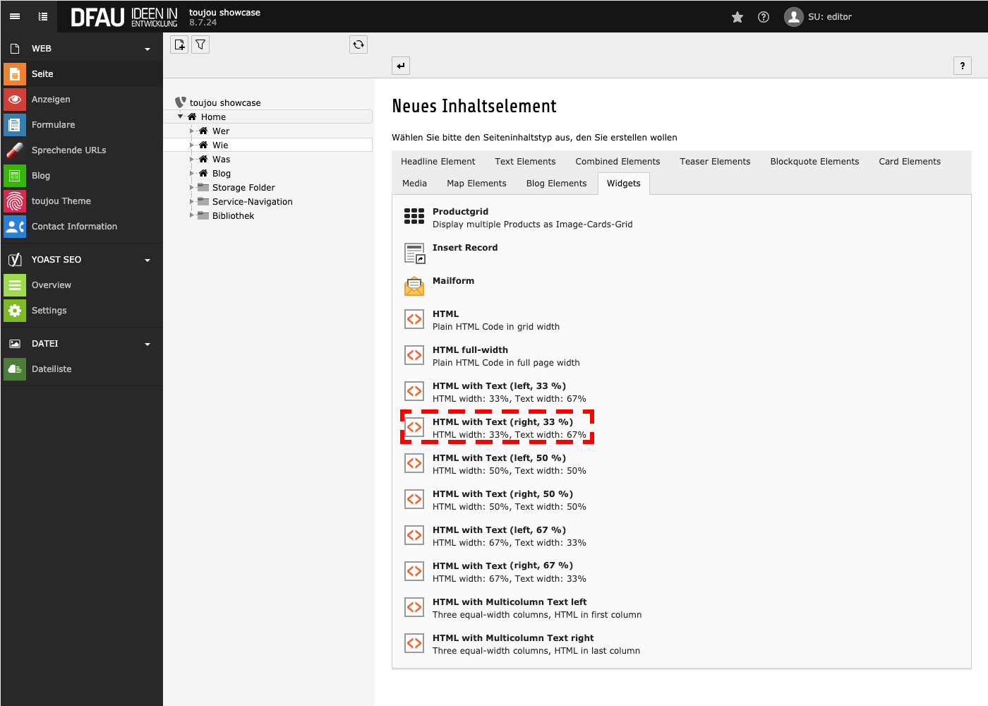 - Im Reiter Widgets wählen Sie HTML with text (right, 33 %); HTML width: 33%, Text width: 67%.