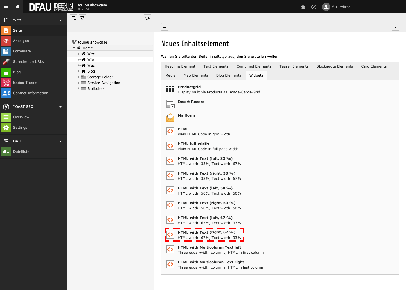 - Im Reiter Widgets wählen Sie HTML with text (right, 67 %); HTML width: 67%, Text width: 33%.