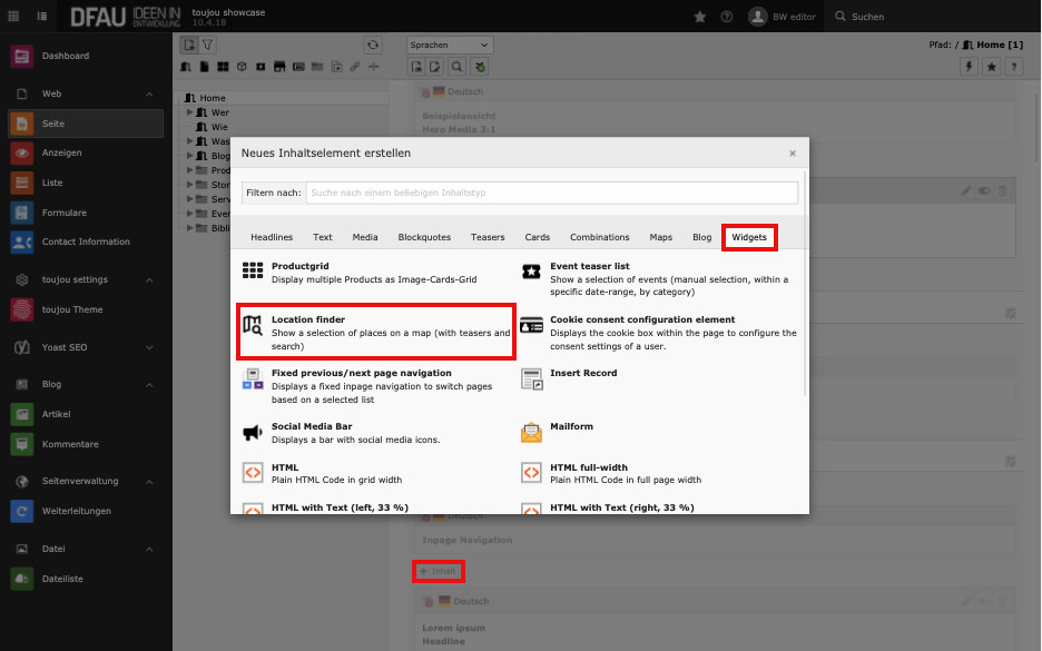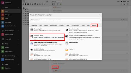- Nachdem Sie im Inhaltsbereich Ihrer Seite auf + Inhalt geklickt haben, öffnet sich das Fenster zur Auswahl des Elements. Wählen Sie den Reiter Widgets und anschließend den Location finder.