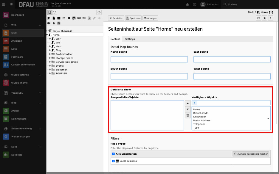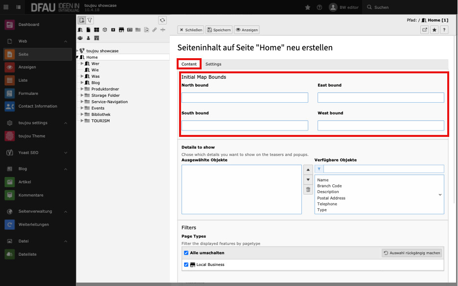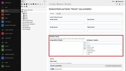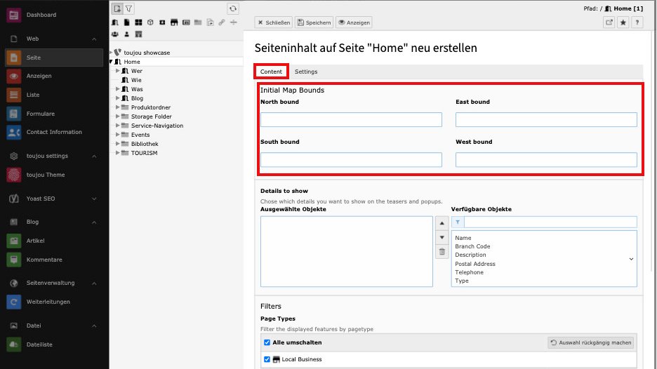 - Im Reiter Content tragen Sie, sofern gewünscht, im Bereich Initial Map Bounds / Ursprüngliche Grenzlinien der Karte die Koordinaten der Karte ein, die beim erstmaligen Laden der Seite aufgerufen werden.