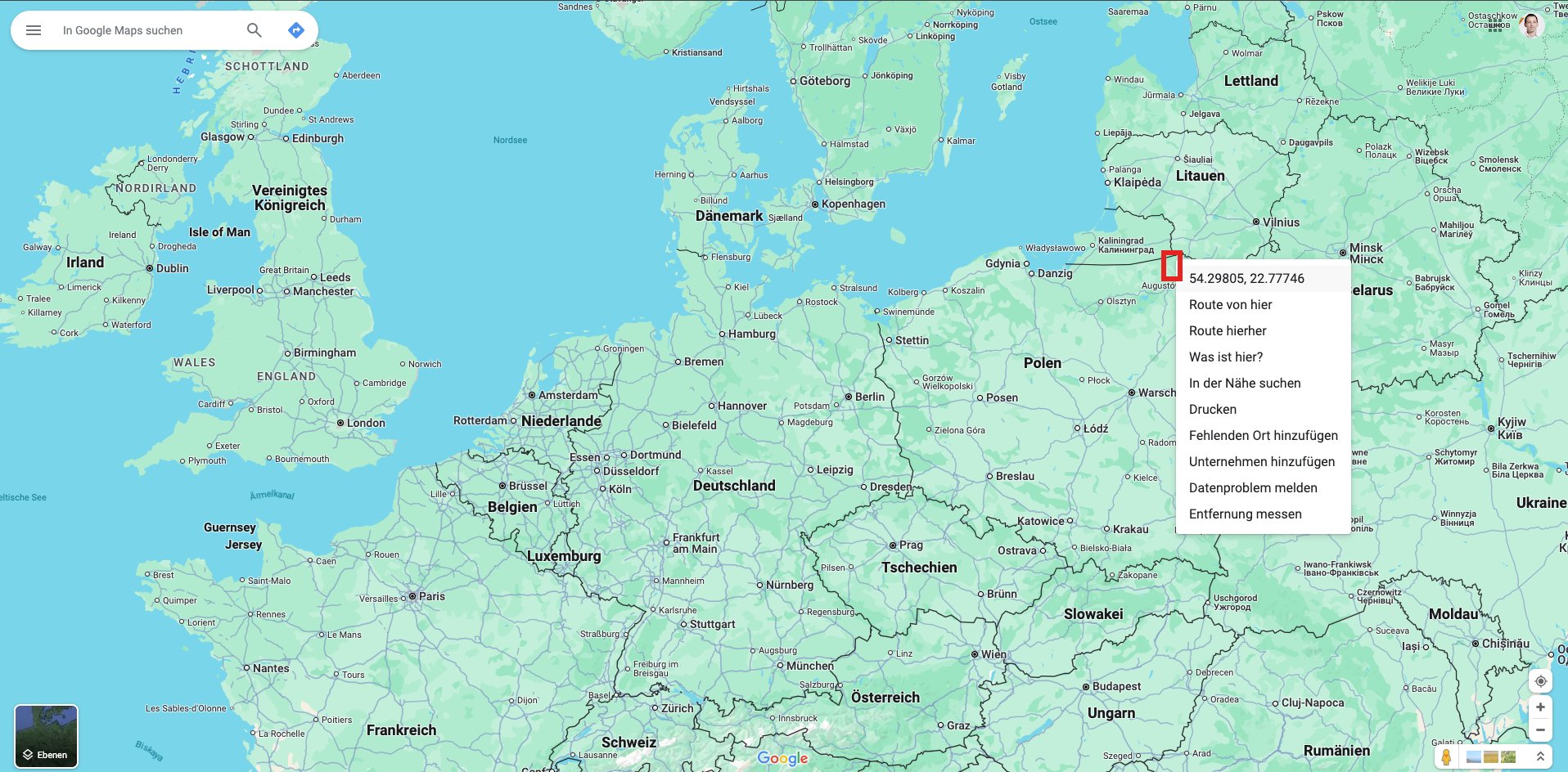 - Klicken Sie via rechter Maustaste für die Koordinaten Nord und Ost auf den Punkt auf der Karte, der für Ihren Kartenausschnitt als Begrenzung für Nord und Ost dienen soll (siehe Screenshot). Durch den Klick öffnet sich ein Pop-Up-Fenster, in dem zwei Koordinaten angezeigt werden, z.B. 53.99392578573011 und 24.132401367552195. Die erste Koordinate tragen Sie im toujou-Backend für Nord (53.99392578573011), die zweite (24.132401367552195) für Ost ein.