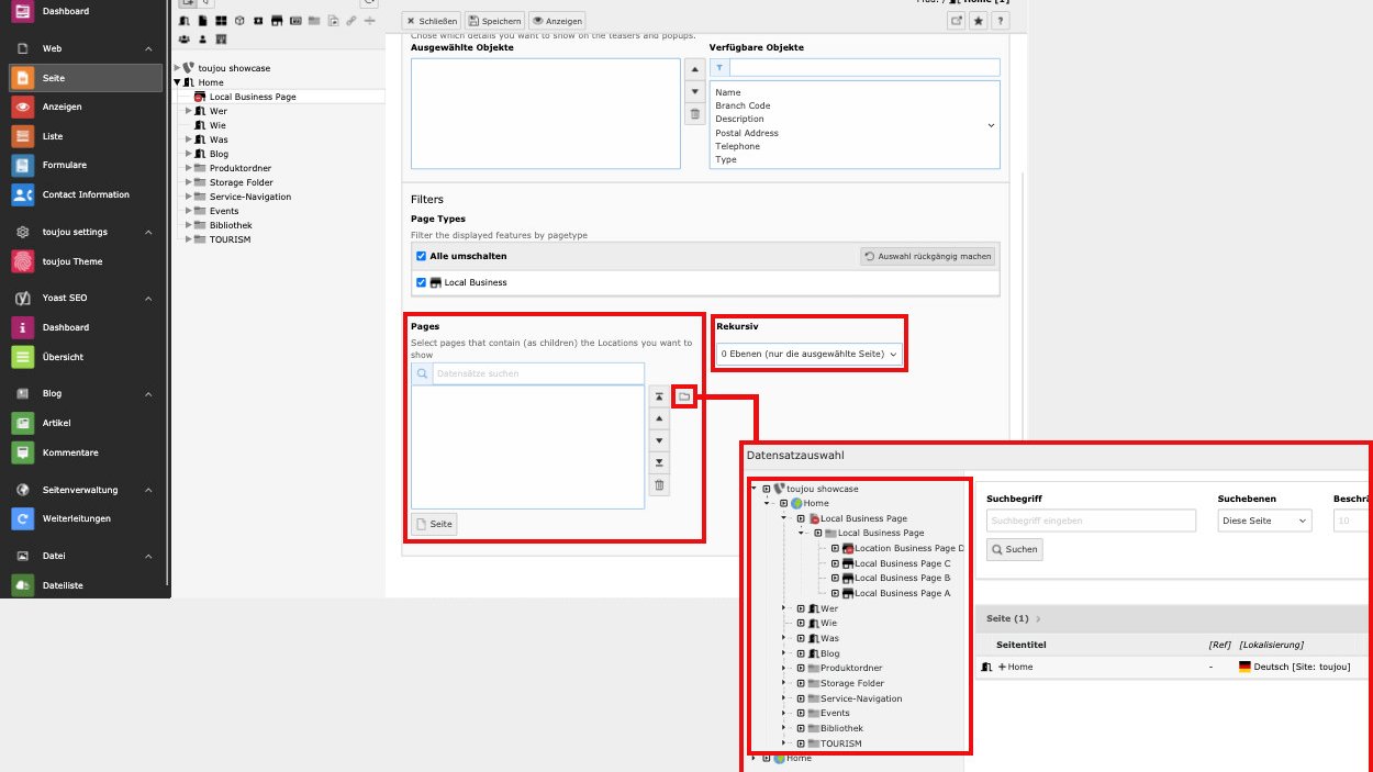 - Anschließend wählen Sie die relevante(n) Seite(n), indem Sie diese einzeln anklicken. Alternativ können Sie eine übergeordnete Seite anklicken. Alle im Seitenbaum der Hierarchieebene darunter aufgelisteten Local Business Pages werden sogleich erfasst.
