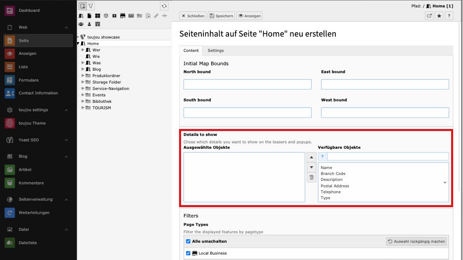 Der Location finder ermöglicht Ihnen, auf der Website verschiedene vordefinierte Markierungen auf einer Karte anzuzeigen. Das toujou-Element ist prinzipiell auf jeder TYPO3-Seite integrierbar und beruht auf Daten von Mapbox oder OpenStreetView.