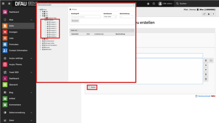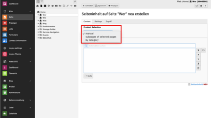 - Subpages of selected pages: Diese Option wählen Sie, wenn Sie Ihre Produkte unterhalb einer Landing Page oder z.B. eines Ordners (siehe Screenshot: Ordner Produkte) sortiert haben. Klicken Sie einzig auf diese übergeordnete Seite und die darunter befindlichen Produktseiten ordnen sich automatisch ein.