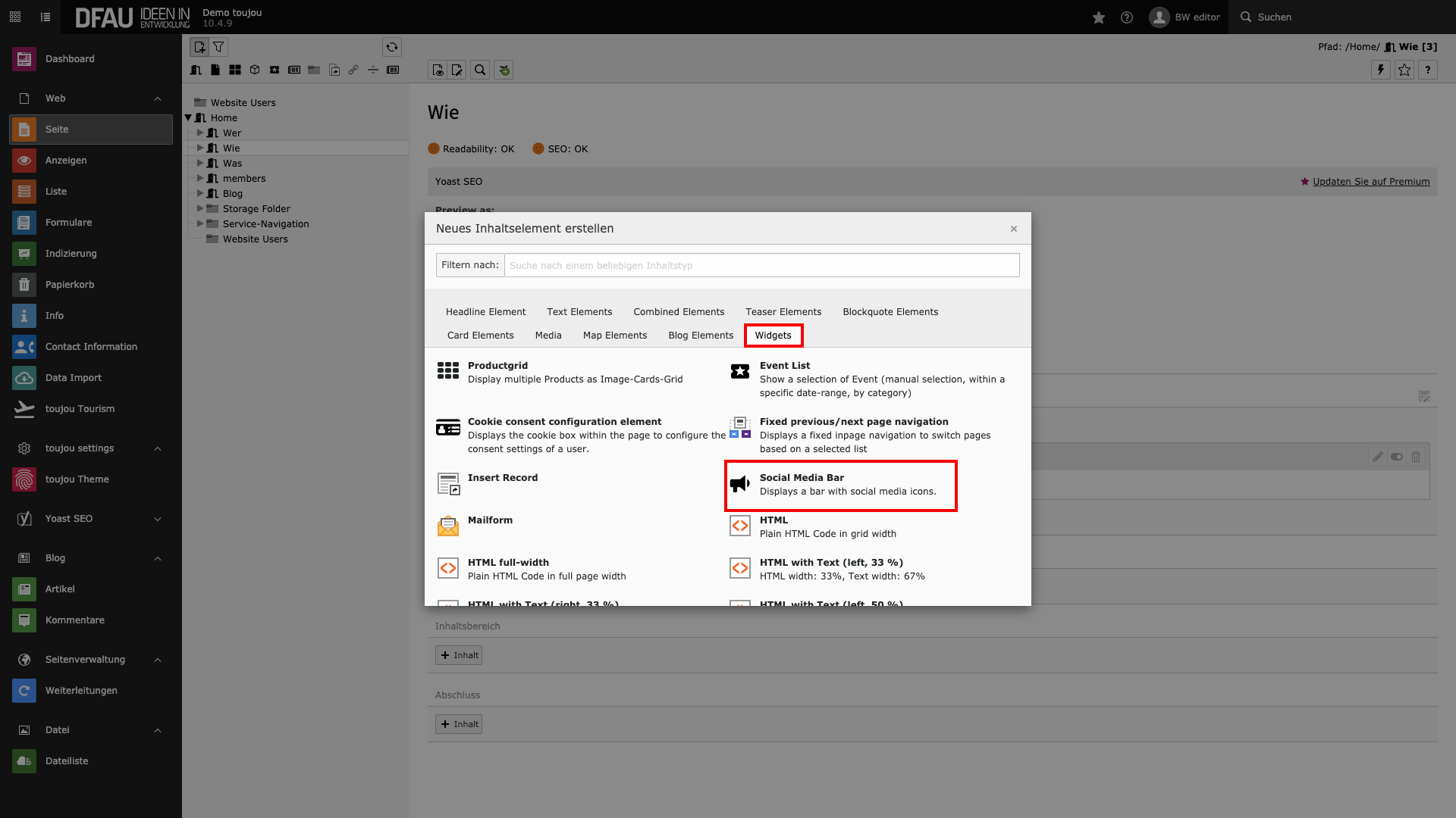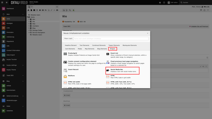 - Wählen Sie im Reiter Widgets das Element Social Media Bar aus. Anschließend öffnet sich ein neues Pop-up Fenster.
