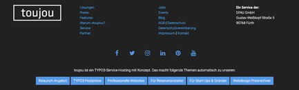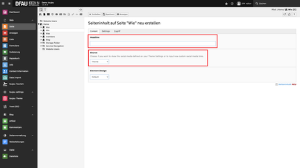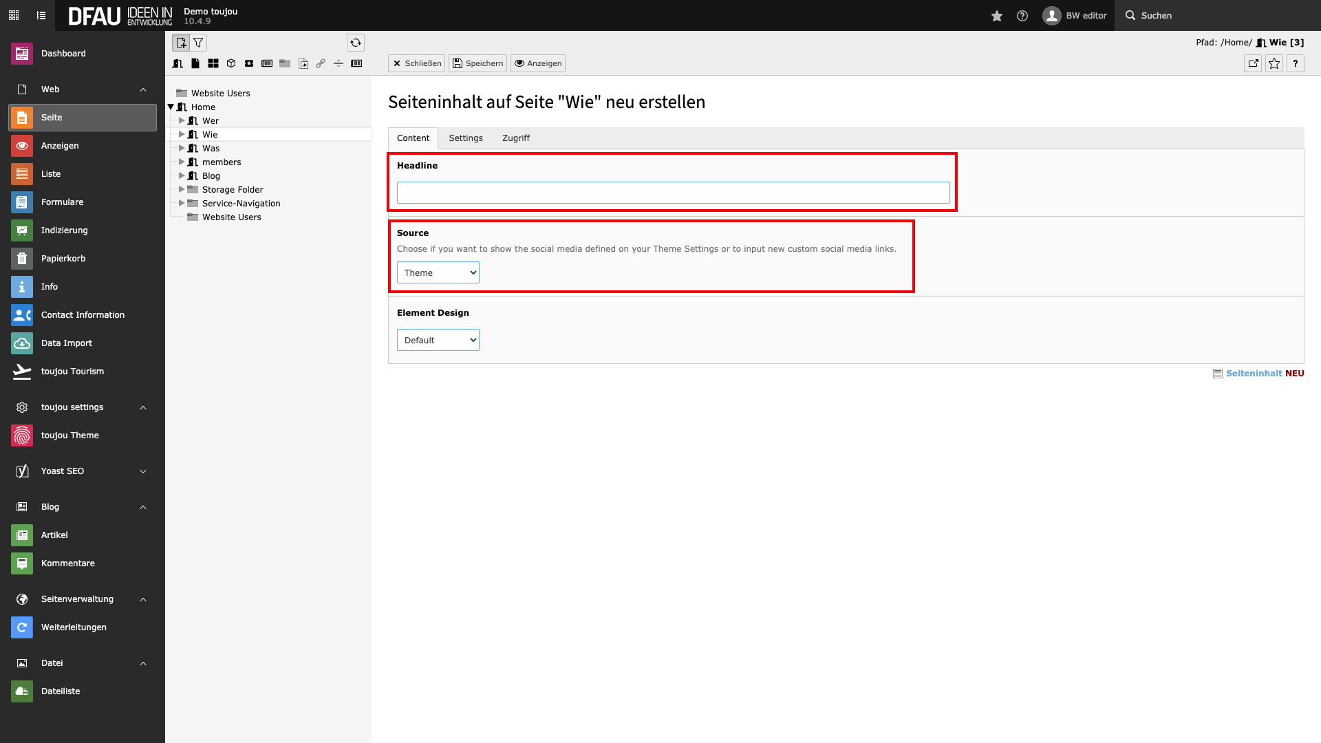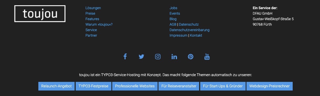 Ganz gleich, ob Sie die Social Media Bar im Contentbereich einer Seite oder im Footer verorten möchten: In beiden Fällen müssen Sie ein neues Inhaltselement erstellen. Bevor die Social Media Bar zur Entfaltung kommt, sollten die Verlinkungen auf Ihre entsprechenden Profile vorhanden sein. Einstellbar sind diese in der Modulleiste unter »toujou Theme« im Reiter Social Media.