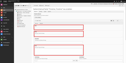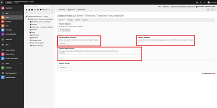 Das Feld im Bereich Timeline Beschreibung ist im Sinne der Barrierefreiheit für Websites auszufüllen. Erst dann wird das Element via aria-label ausgezeichnet. Beim beschreibenden Text sind Ihrer Kreativität keine Grenzen gesetzt. Als Orientierung dient stets die Beschreibung des Zwecks der entsprechenden Timeline.