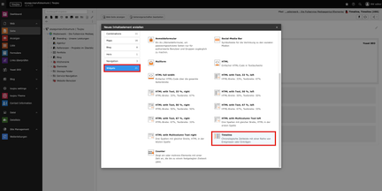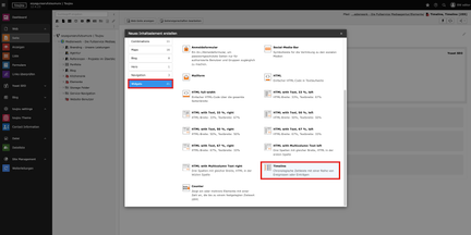 - Nachdem Sie im Inhaltsbereich Ihrer Seite auf + Inhalt geklickt haben, öffnet sich das Fenster zur Auswahl des Elements.
