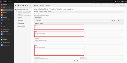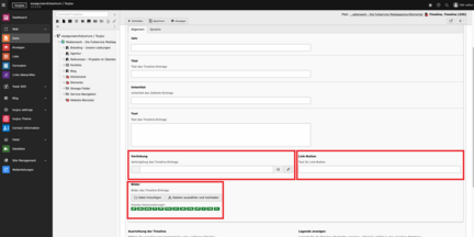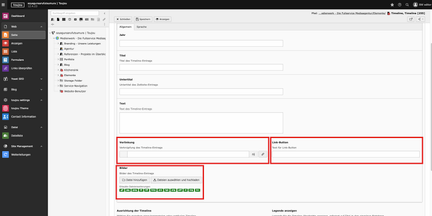 Anmerkungen: Für die Funktionalität des Elements Timeline müssen mindestens zwei Einträge angelegt sein. Das Feld beim Linkbutton muss ausgefüllt sein, damit der Link im Frontend angezeigt wird.