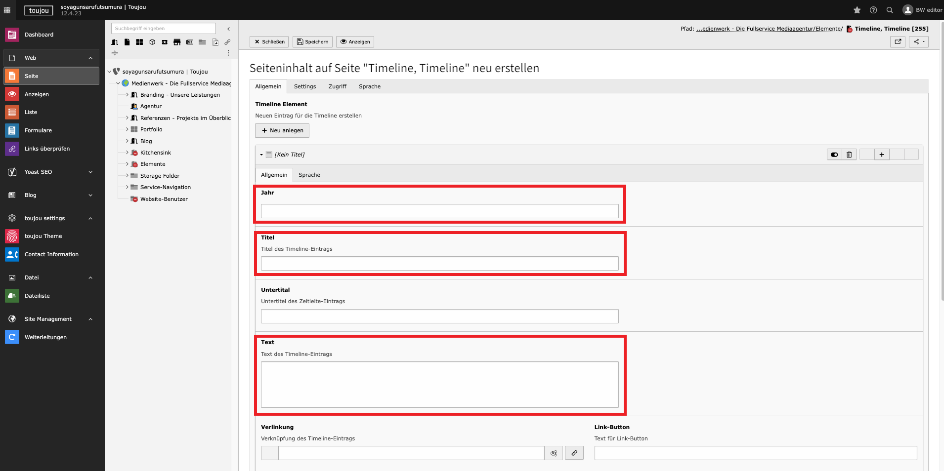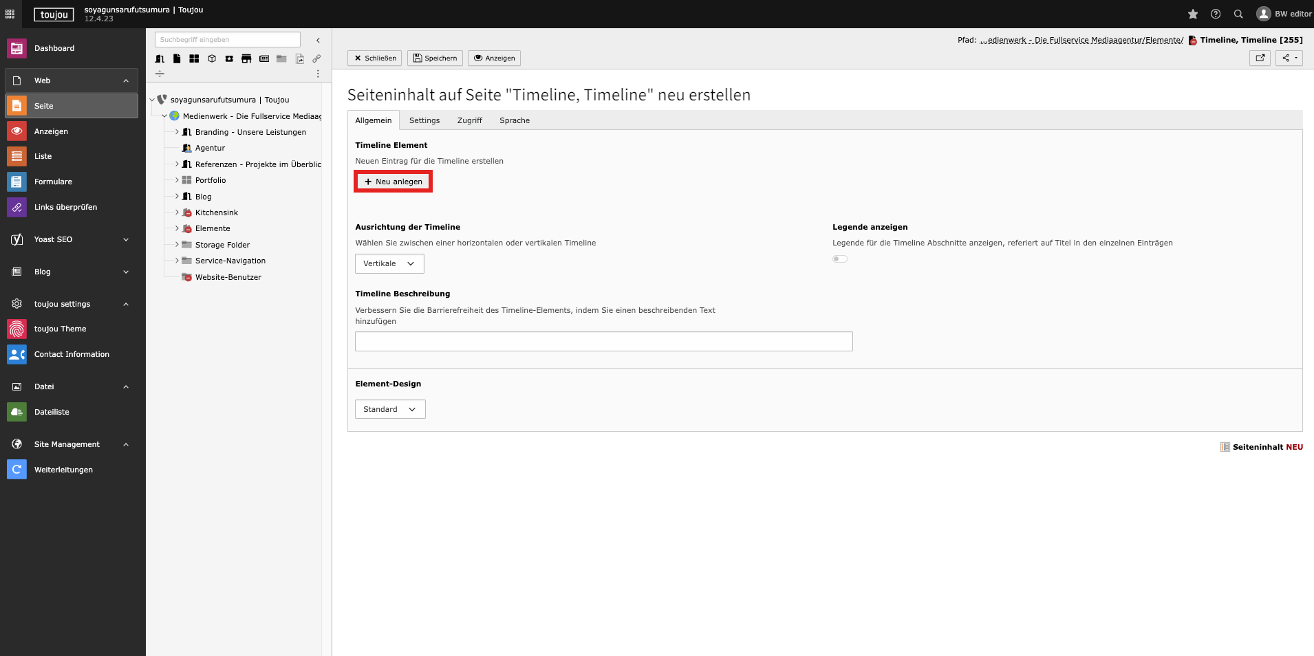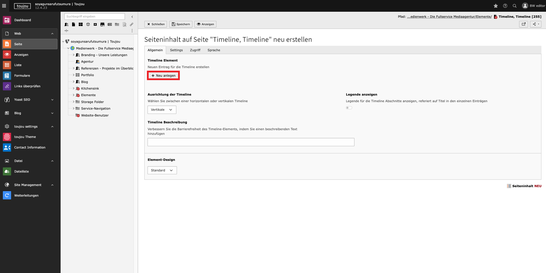 - Im Reiter Allgemein klicken Sie im Bereich Timeline Element auf + Neu anlegen um einzelne Einträge anzulegen.