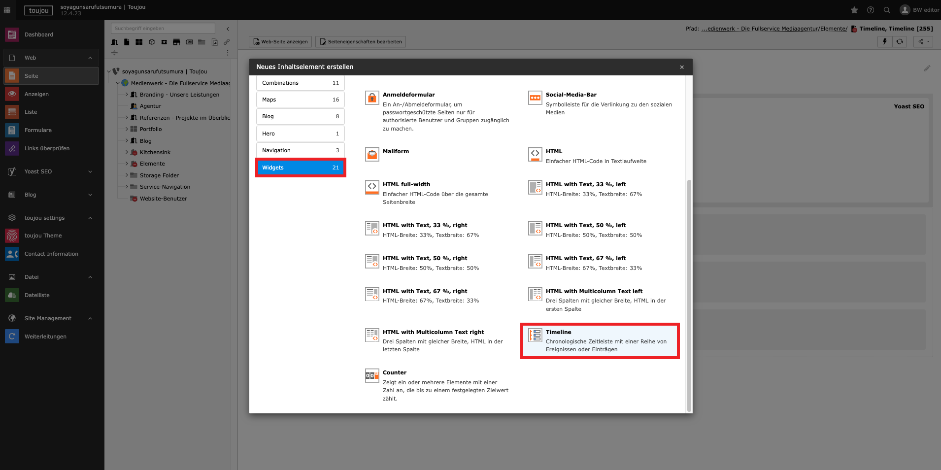 - Wählen Sie den Reiter Widgets und anschließend Timeline.