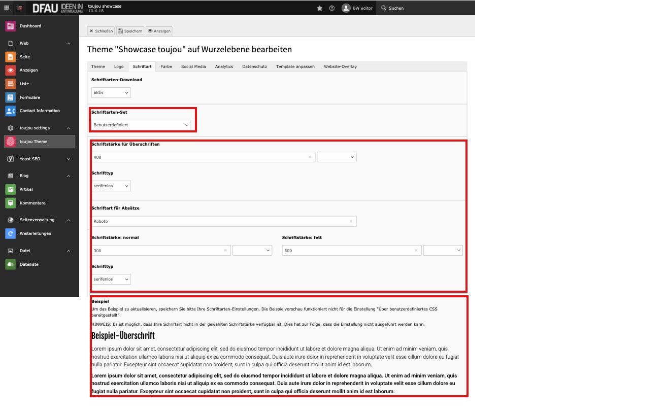 - »Benutzerdefiniert« sind in toujou freie Google-Schriftarten. Diese stehen Ihnen hier zur Verfügung: Google Fonts ↗. Achten Sie darauf, dass die Schrift mit UTF8 kompatibel ist.