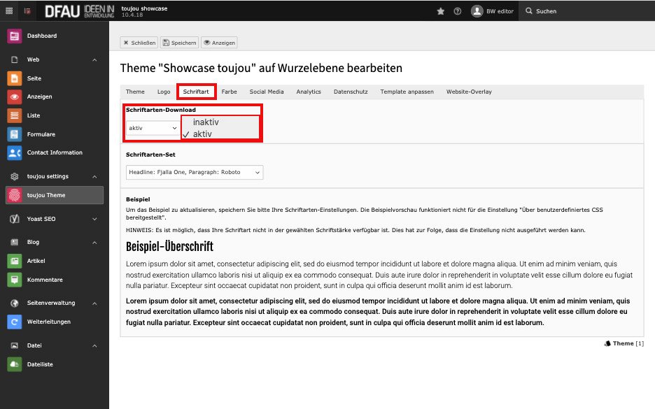 - Bei Schriftarten-Download stellen Sie im Drop-Down-Balken ein, ob die Google-Fonts, mit denen toujou arbeitet, für Ihre Website aktualisiert werden sollen (aktiv) oder nicht (inaktiv). Voreingestellt in toujou ist die aktivierte Einstellung. Somit werden die Schritarten heruntergeladen und lokal auf einer Website eingebunden, was dem Datenschutz unabhängig von den allgemeinen Consent-Einstellungen gerecht wird.