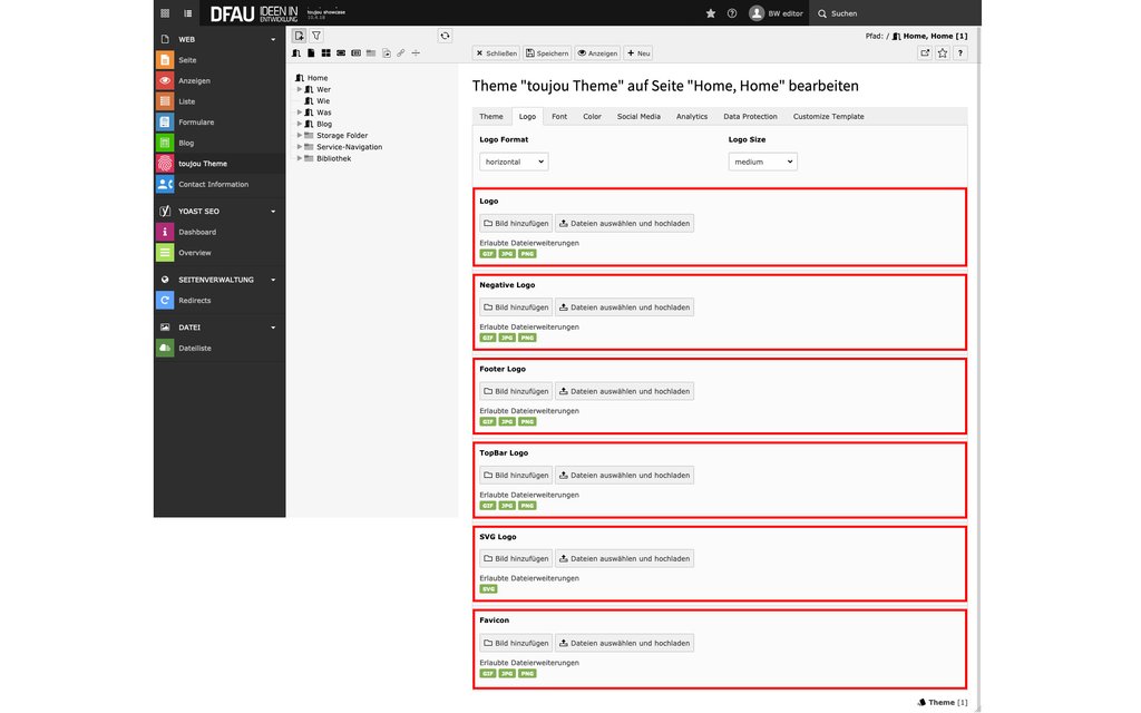 - Es stehen Ihnen weitere Nutzungsvarianten, namentlich ein Negative Logo, ein Footer Logo (für die automatisierte Ausgabe im Footer), ein TopBar Logo (für die mobile Darstellung) oder eine Version im SVG-Format, ein SVG Logo zur Verfügung. Ist ein SVG-Logo hinterlegt, wird automatisch dieses Logo ausgespielt.