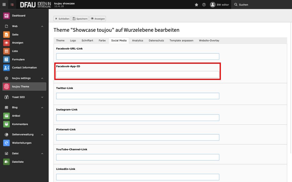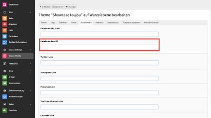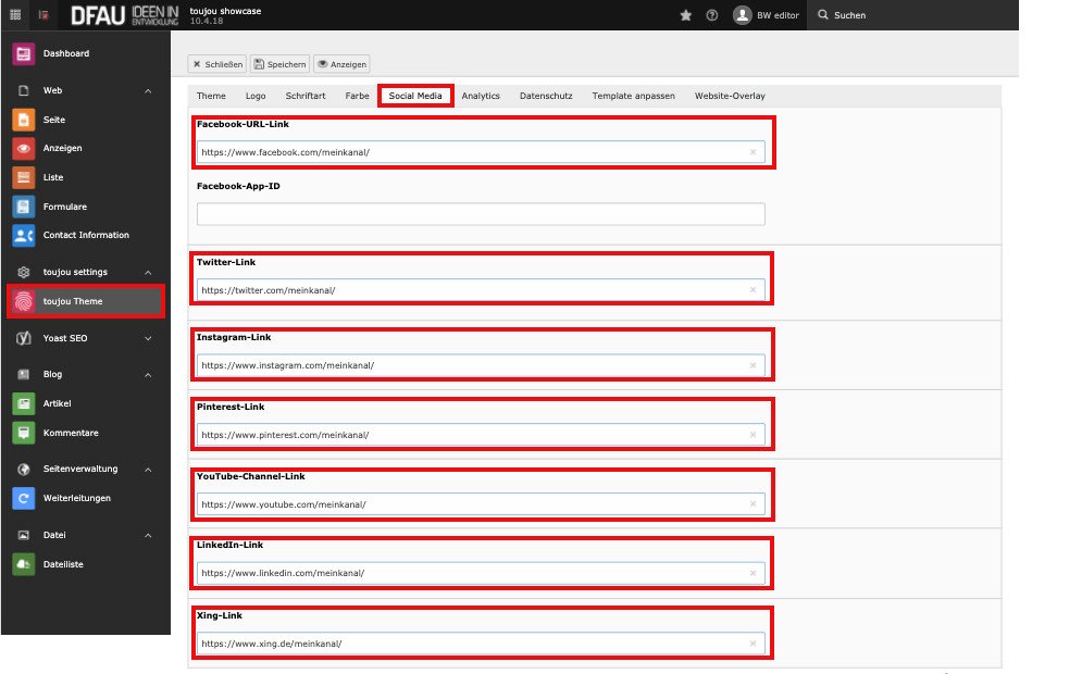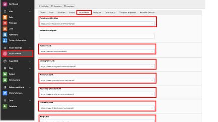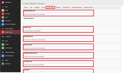 - Um Social-Media-Icons auszuspielen (z.B. im Footer), müssen die URLs für diejenigen Kanäle, die Sie anbieten, zentral angelegt werden.
