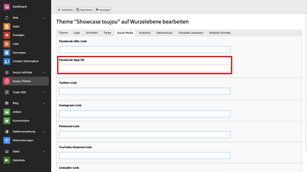 In toujou haben Sie die Möglichkeit, Verknüpfungen für die Social-Media-Plattformen Facebook, Twitter, Instagram, Pinterest, LinkedIn sowie Xing zu erstellen.