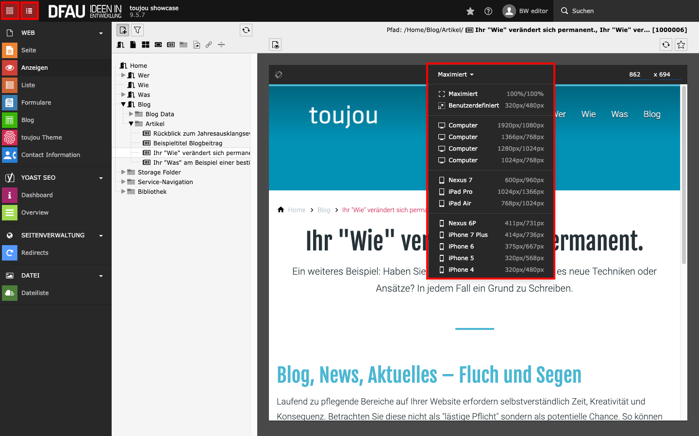 Mit Klick auf das rote Icon Anzeigen in der linken Menüleiste überprüfen Sie Ihre jeweiligen Einstellungen. Hier können Sie Größen verschiedener Endgeräte auswählen.