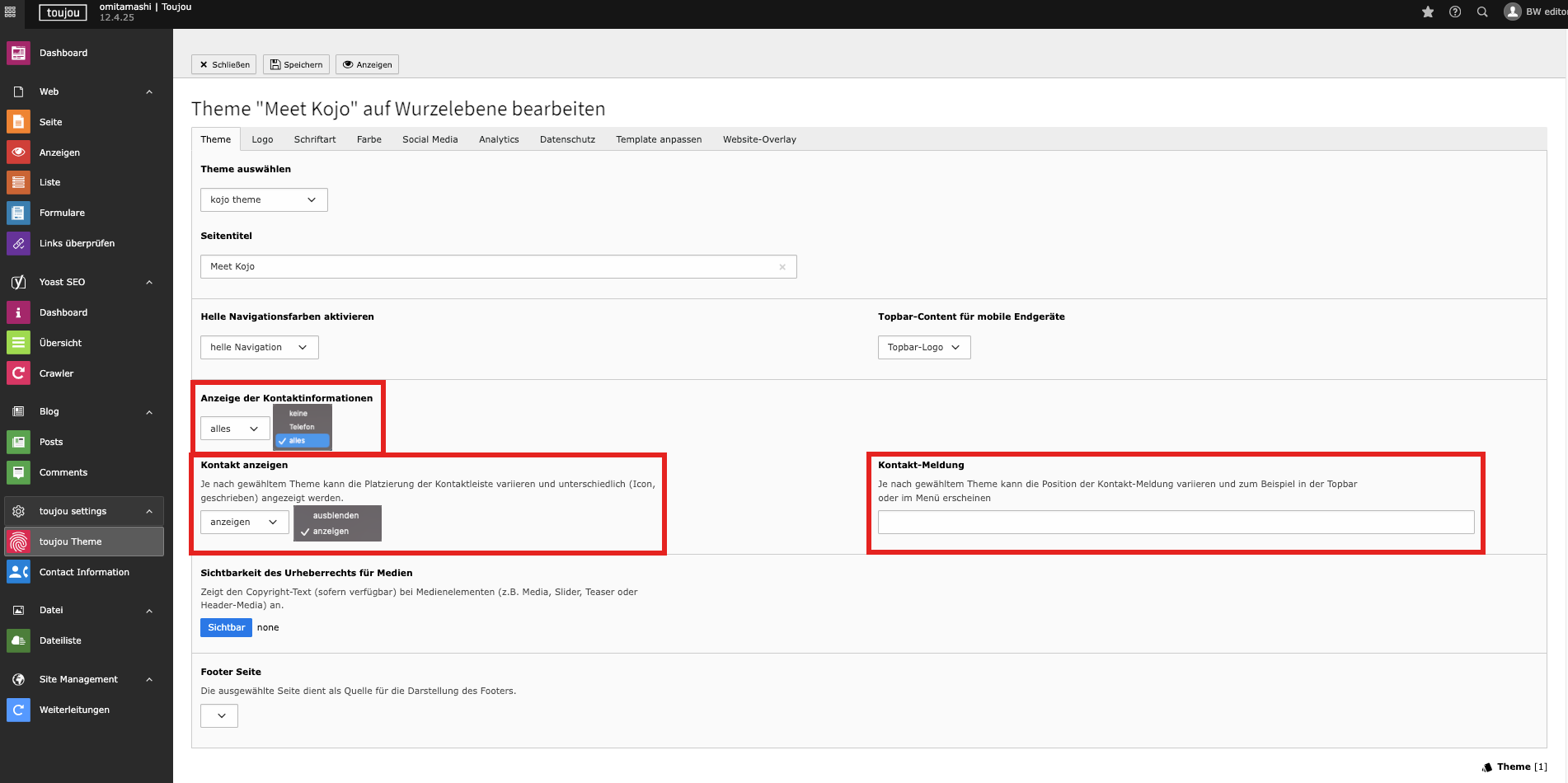 - Entscheiden Sie bei Kontakt anzeigen, ob Ihre Kontaktinformationen auf allen Seiten (in der Topbar) angezeigt werden (anzeigen) oder nicht (ausblenden).