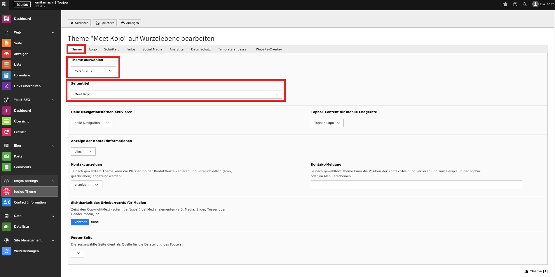 - Bei Theme wählen können Sie im Drop-Down-Balken ein Theme wählen. Dort sind die verfügbaren toujou-Themes hinterlegt.